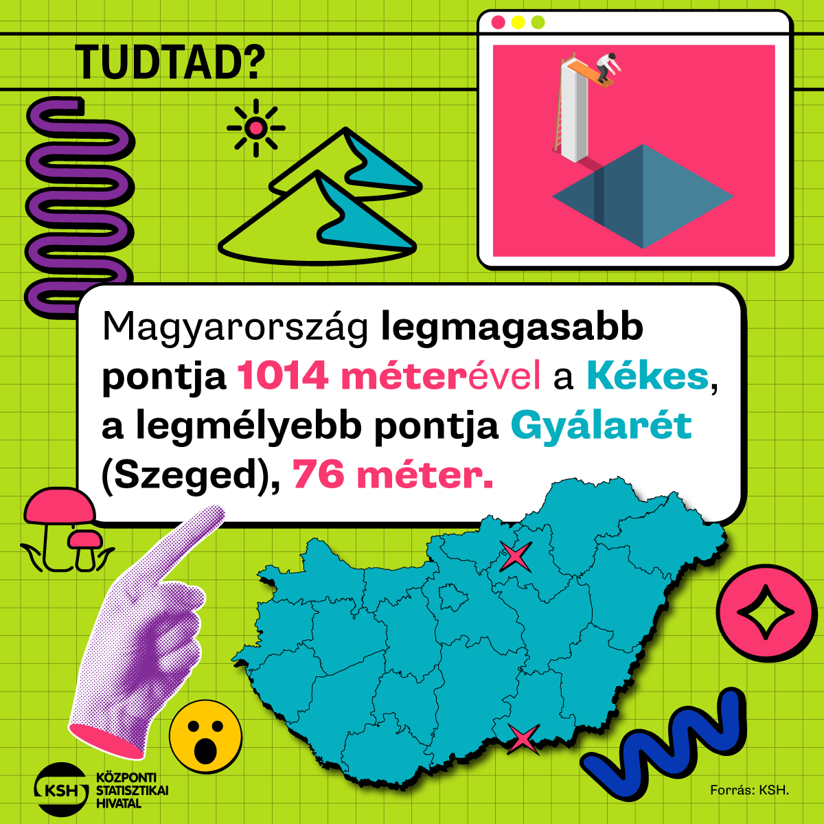 Magyarország legmagasabb pontja 1014 méterével a Kékes, a legmélyebb pontja Gyálarét (Szeged) 76 méterrel.