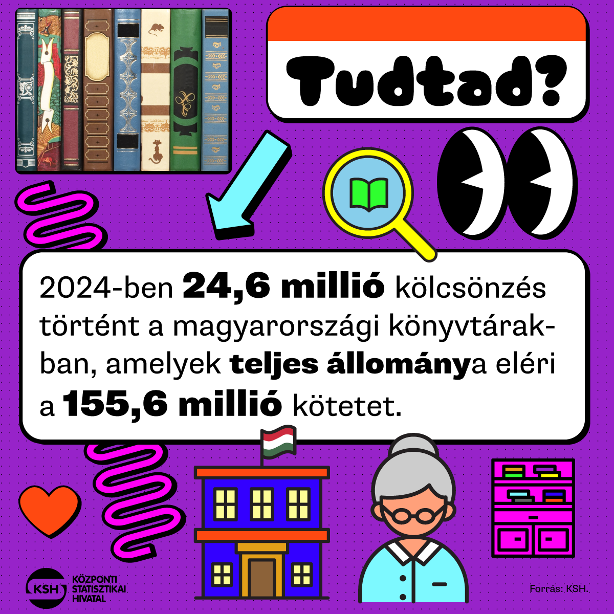 2024-ben 24,6 millió kölcsönzés történt a magyarországi könyvtárakban, amelyek teljes állománya eléri a 155,6 millió kötetet.
