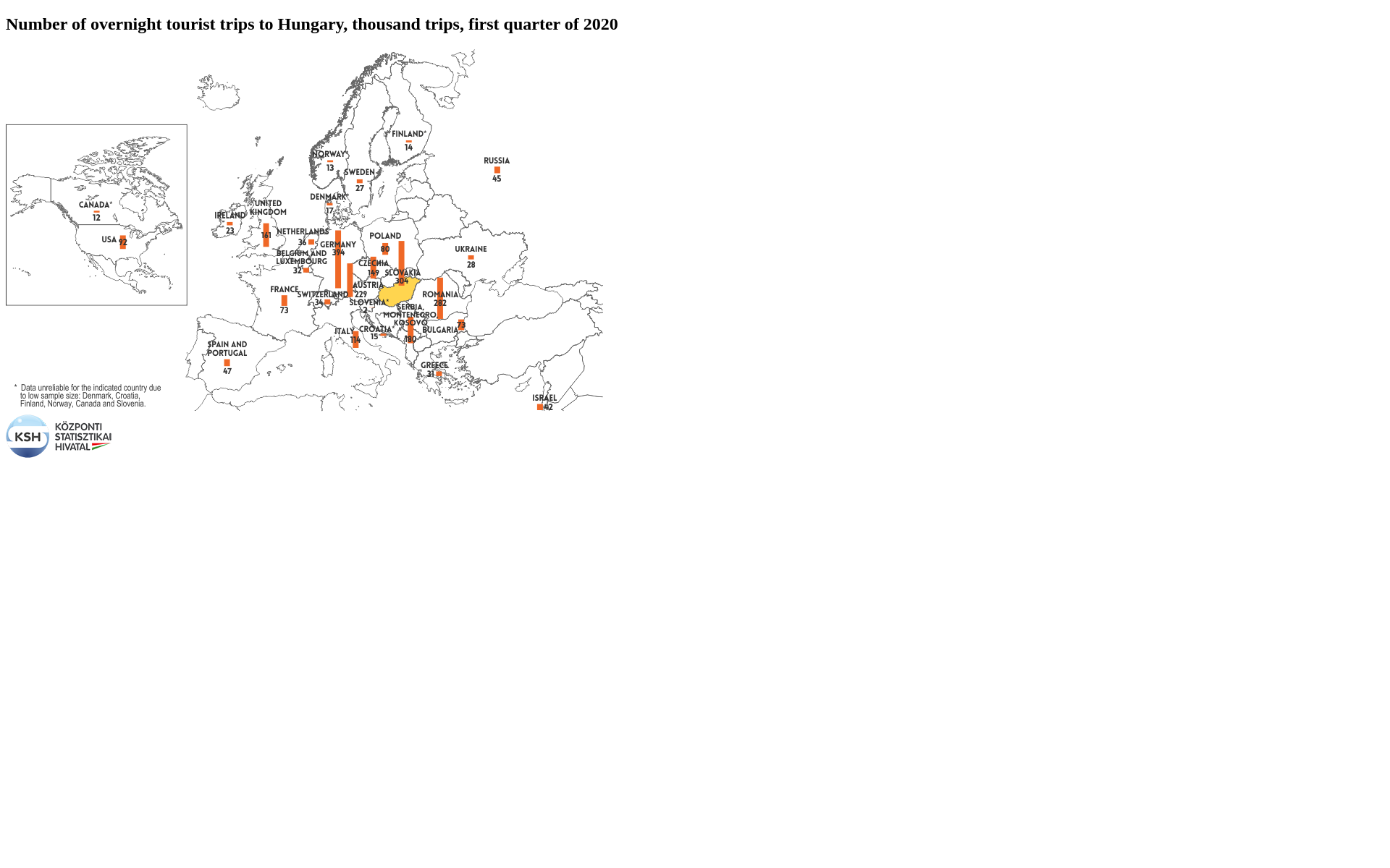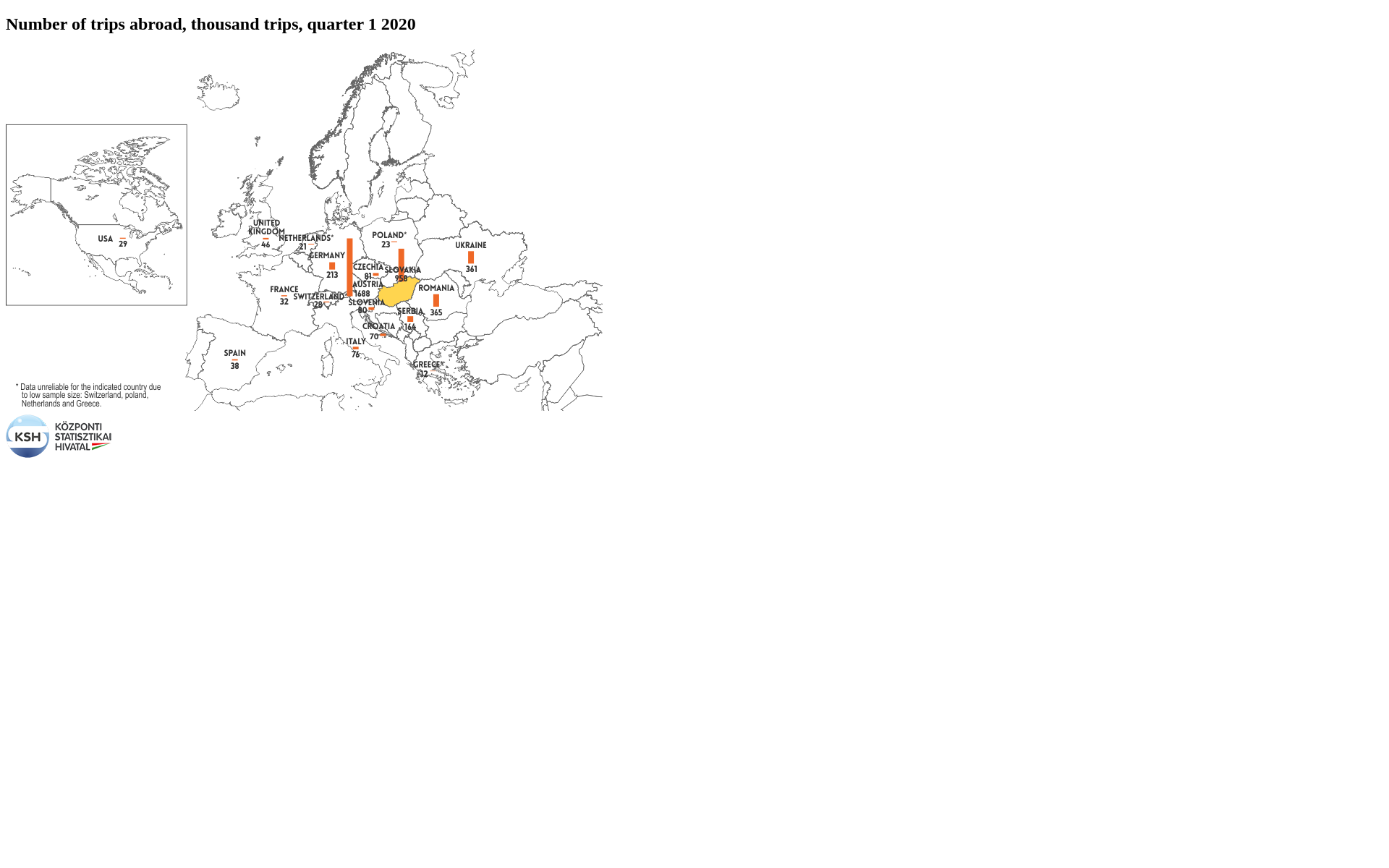 International trips, both to and from Hungary, showed an increasing trend in previous periods, which turned into a decline in the first quarter of 2020 (March). Due to the epidemic, Hungary introduced travel restrictions in mid-March, reducing foreign arrivals by 13% and inbound visitor spending by 7.9% at current prices in the first quarter of 2020Due to the border closure and survey suspension introduced from mid-March, data on tourism demand for the first quarter are only available for the period from 1 January to 13 March 2020, so they cannot be fully compared with data for previous periods.[1] compared to the same period last year. Overnight business and conference arrivals as well as same day leisure and VFRVisiting friends and relatives.[2] arrivals decreased significantly, and 19% fewer outbound trips were made from Hungary.