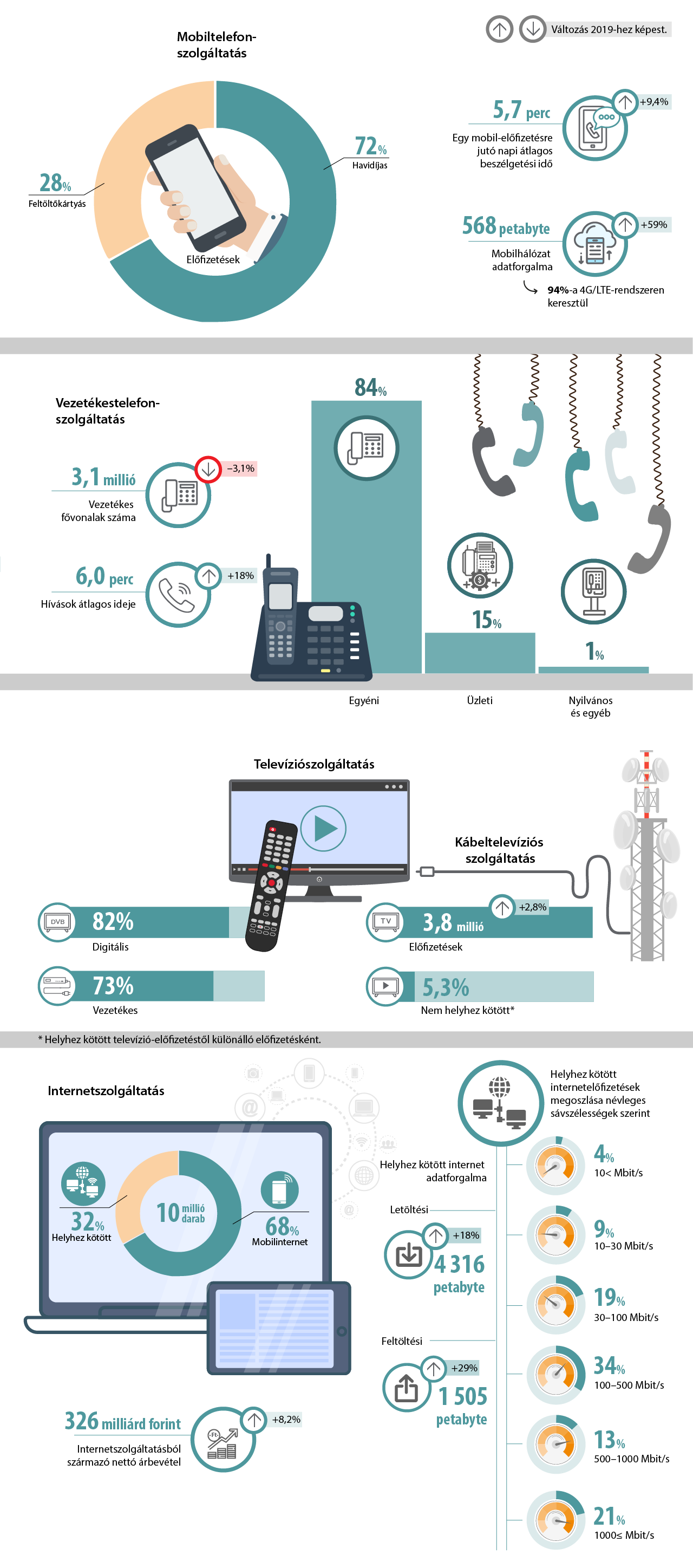 2020-ban a mobilhálózatokból kezdeményezett hívások száma stagnált, a mobiltelefonálással töltött összes idő a korábbi éveket meghaladó mértékben, 11%-kal emelkedett az egy évvel korábbihoz képest. A növekedésben szerepet játszottak a Covid19-járvány miatt megváltozott kapcsolattartási szokások. Továbbra is meghatározó volt a saját hálózaton belüli hívásforgalom, a beszélgetések több mint fele hálózaton belül zajlott. 2020-ban 2097 percnyi beszélgetés jutott egy mobil-előfizetésre, ami naponta átlagosan 5,7 percnyi telefonálást jelentett.