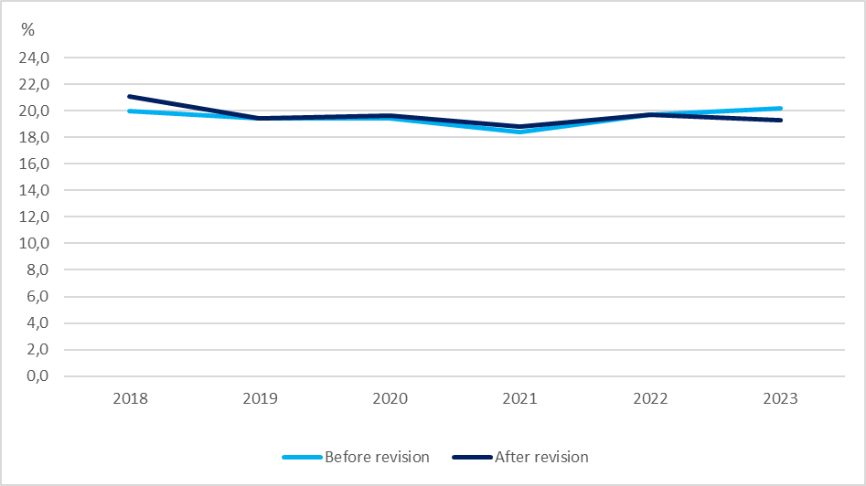 Proportion of those at risk of poverty or social exclusion before and after revision