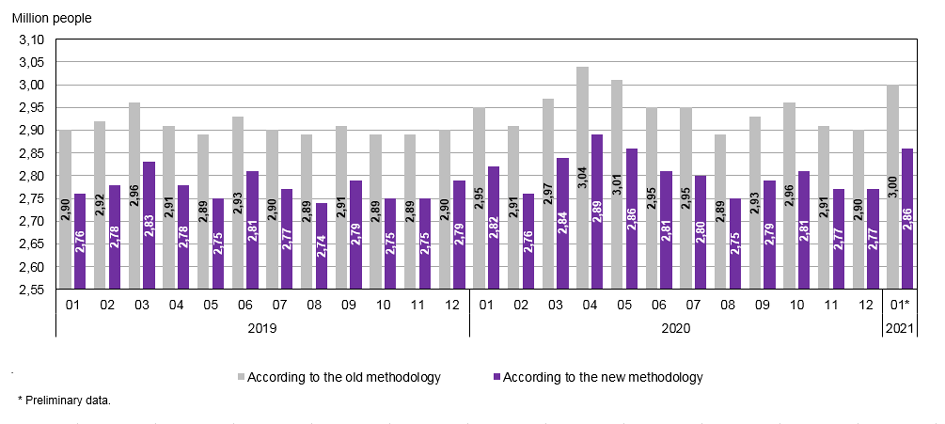 In January 2021, data according to the new methodology showed 4 million 537 thousand employed and a 71.1% employment rate (4 million 403 thousand employed and a 68.9% employment rate were recorded according to the old methodology). At the same time, 2 million 864 thousand people were unemployed or inactive (2 million 997 thousand people according to the old methodology).